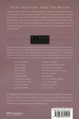 When you need to know how to do something, a manual is the best place to start. 1 2 Timothy and Titus might be called "the Teacher's Manual," because so much of what they contain is about the kind of teaching that Christian leaders should–and shouldn't–be giving. Just as Timothy and Titus needed help to lead their young churches well in the midst of powerful cultural forces, we need guidance for correct leading and living in our own context. These studies on Paul's letters point us in the right direction. This guide by Tom Wright can be used on its own or alongside his New Testament for Everyone commentary on 1 2 Timothy and Titus. It is designed to help you understand Scripture in fresh ways under the guidance of one of the world's leading New Testament scholars. Thoughtful questions, prayer suggestions, and useful background and cultural information all guide you or a group more deeply into God's Word. Discover how you can participate more fully in God's kingdom.
