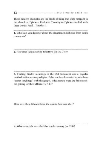 Deteriorating values. Competing religions. Weakening morality. Do you feel sometimes that the world presents you with more problems than you can handle? Timothy and Titus faced all of these tough issues as young church leaders. But Paul encouraged them to put aside timidity and insecurity, and to find strength in Christ. As Pete Sommer guides you in this eleven-session LifeGuide ® Bible Study, you'll also find the support you need to follow through in obedience to God's Word. For over three decades LifeGuide Bible Studies have provided solid biblical content and raised thought-provoking questions—making for a one-of-a-kind Bible study experience for individuals and groups. This series has more than 130 titles on Old and New Testament books, character studies, and topical studies.