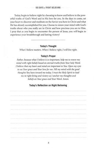 Today's Scripture: A scripture to meditate on to recalibrate your mind and believe right about God's heart and plans for you. Today's Excerpt: A key truth about right believing that ministers and delivers God's transforming grace to you. Today's Thought: An uplifting, liberating, and powerful thought for the day.Today's Reflection: A place to journal your thoughts and reflections.Today's Prayer: A simple but powerful prayer to help you express your heart to your heavenly Father.