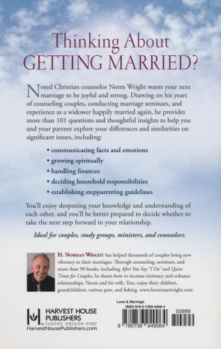 Respected Christian counselor H. Norman Wright draws from his extensive experience to help couples establish strong, loving marriages. Whether divorced or widowed, people who marry again face unique challenges. Through 101 questions, Norm helps readers know their own views and understand where they agree and disagree with their future mates on finances, roles, sexuality, children, responsibilities, and previous relationship issues.