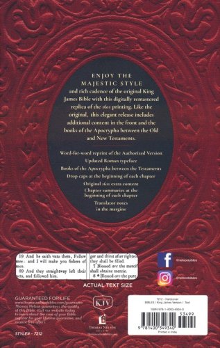 Word-for-word reprint of the first edition of the Authorized VersionBooks of the Apocrypha between the Old and New TestamentsDrop caps at the beginning of each chapterOriginal introductions from the 1611, including the article, "From the Translators to the Readers"Illustrated genealogy of key biblical figures from Adam and Eve to JesusReading plan to help you read through the entire Bible in a yearTranslator notes in the outer and gutter marginsUpdated typeface for easier reading