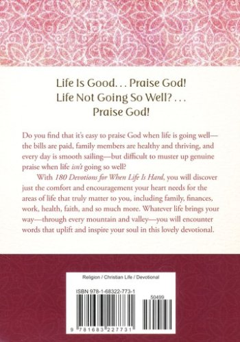 With 180 Devotions for When Life Is Hard, you will discover just the comfort and encouragement your heart needs for the areas of life that truly matter to you, including family, finances, work, health, faith, and so much more. Whatever life brings your way—through every mountain and valley—you will encounter words that uplift and inspire your soul in this lovely devotional.
