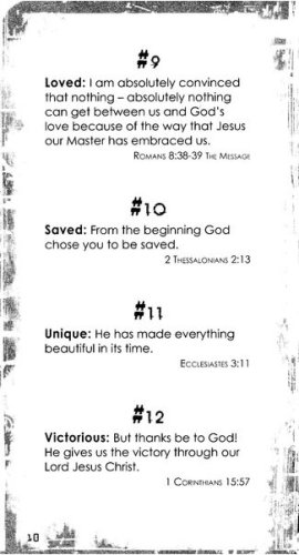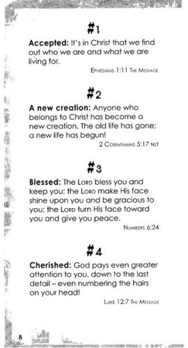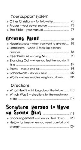 Inspiring gift book for teens starts with a colorful collage cover design, and opens on five encouraging collections of Bible verses: Family, Friends, Living the Christian Life in a Non-Christian world, Growing Pains, and Scripture verses to have on Speed-Dial.199 favorite Bible verses are included, from a variety of Bible versions and translations. Presentation page is ready for your personal comments; an easy-to-mail gift book for all teens. 127 pages. 4" x 7". For guys or girls.