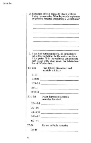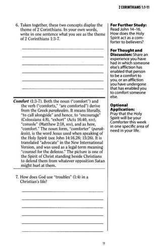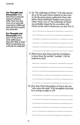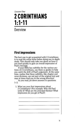 FeaturesCover the entire book of 2 Corinthians in 13 lessonsEquip yourself to lead a Bible studyImagine the Bible’s historical worldStudy word origins and definitionsExplore thoughtful questions on key themesGo deeper with optional projectsAdd your notes with extra space and wide marginsFind the flexibility to fit the time you have