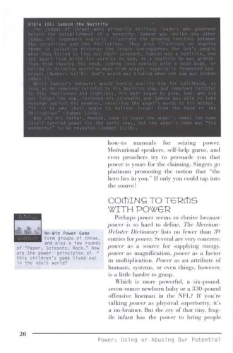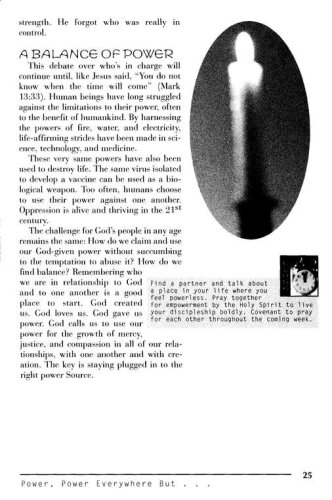 Power: Using or Abusing Our Potential explores questions like "How can we survive in a me-first world and remain faithful to the One who said, Whoever wants to be first must be last of all and servant of all? Mark 9:35b. Look at the ways power is understood, experienced, used, and all too often abused in secular society, in the church, and in the Bible itself through Bible study, discussion, and reflection.