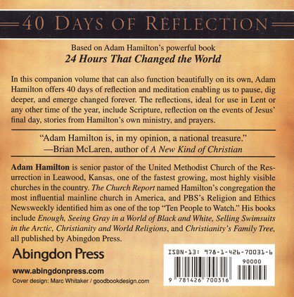 Pastor and popular author Adam Hamilton offers 40 days of devotions enabling us to pause, reflect, dig deeper, and emerge changed forever. The devotions, ideal for use in Lent or any other time of the year, include Scripture, reflection on the events of Jesus’ final day, stories from Hamilton’s own ministry, and prayer. The devotions can be used alone or as a companion to Hamilton’s best-selling book, 24 Hours that Changed the World.