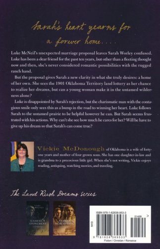 When Sarah Worley rejects Luke McNeil’s proposal to pursue property in the Oklahoma Territory land lottery in 1901, the ranch hand pulls up stakes and goes after her. But he’s the last person she wants to see. The land lottery gives Sarah the chance to realize her dream of independence and a home of her own. But with it comes challenges she never considered. When her dream becomes a nightmare, she must decide whether to stay on her land or give up and return to the life she left. Luke hopes that by winning a claim, he can give Sarah the home she’s always wanted. How can he prove his love and show the stubborn woman that he’s the right man for her?