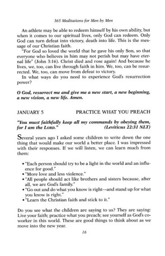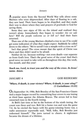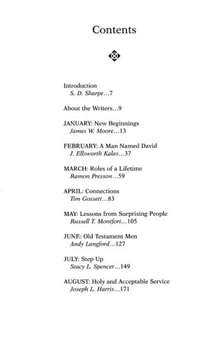 Introduction Man’s search for meaning is the primary motivation in his life. —Viktor Frankl, Man’s Search for Meaning There is a longing deep within every man’s heart to discover meaning and purpose in life; to lead a life of significance as opposed to a life of “success”; to live a life of adventure, conquest, and victory; to make a difference and leave a positive, enduring mark on the world. Yet, as Henry David Thoreau observed, “The mass of men lead lives of quiet desperation.” Although Thoreau penned these words more than a century ago, they still ring true today. So many men—including devoted Christian men—wake up one day and realize they are leading lives of quiet desperation, silently “losing themselves” as they strive to meet unrealistic expectations, overcome mounting work and family pressures, and battle unrelenting temptations. These challenges can easily sidetrack men, causing them to lose their spiritual focus. Whether consciously or unconsciously, many men subsequently spend their time and energy and resources searching for significance in pursuits and people and things that can never fully satisfy. Some simply give up on ever finding lasting meaning and purpose in this world. Others find themselves somewhere in between. In any case, the result is often the same: a pervading sense of exhaustion, futility, or hopelessness. Yet there is a remedy to this cultural epidemic, and it is found in reclaiming and living out every man’s true purpose, which is found in God alone. As Saint Augustine wrote, “Thou hast made us for Thyself, O Lord, and our hearts are restless until they rest in Thee.” The apostle Paul expressed it this way: “Everything, absolutely everything, above and below, visible and invisible . . . everything got started in [Christ] and finds its purpose in him” (Colossians 1:16 The Message). 365 Meditations for Men by Men is intended to help men focus on their relationship with God and, consequently, find real meaning and purpose in life. Twelve different Christian men share their reflections on what it means to be a man who seeks to follow Christ each and every day. Drawing upon the lives of men in the Bible as well as their own personal experiences, the writers present timeless truths and valuable life lessons that will speak to men of every age and experience. In addition to offering inspiration and encouragement, they provide counsel on practical matters such as how to · know God; · get your priorities in order; · become spiritually fit; · be holy and righteous; · make a difference; · be equipped; · step up; · take risks; · stand firm; · serve God wholeheartedly. As you make your way through the year (whether you start in January or June), you will be undergirded by a sense of brotherhood—an assurance that you are not alone on this journey. With this confidence, may you boldly and courageously pursue a full and abundant life in Christ! S. D. Sharpe, editor
