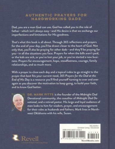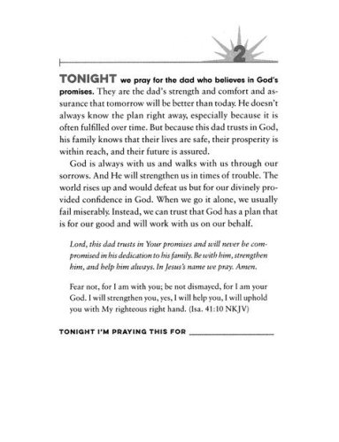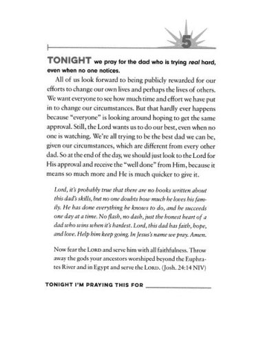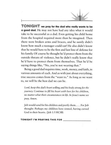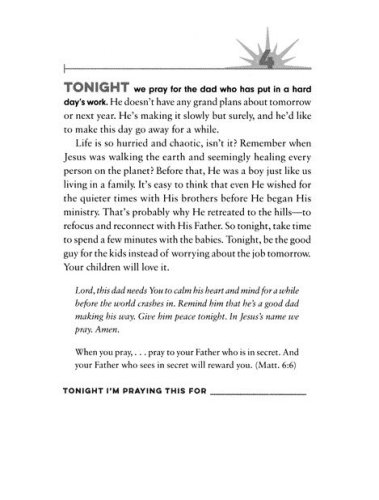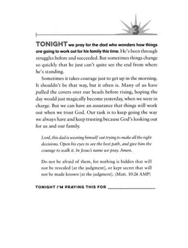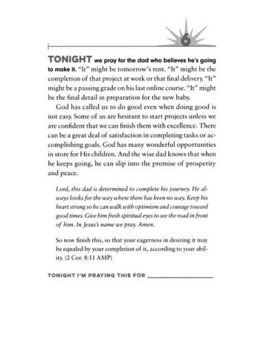 That's what this book is all about. Through 365 reflections and prayers for the end of your day, you'll be drawn closer and closer to the heart of God. Not only that, you'll be praying for other dads too–and they'll be praying for you–in all the situations you face. Prayers for when the bills aren't paid, or the kids are sick, or you've lost your job, or you've started a new business. Prayers for encouragement, hope, steadfastness, courage, family relationships, and so much more.