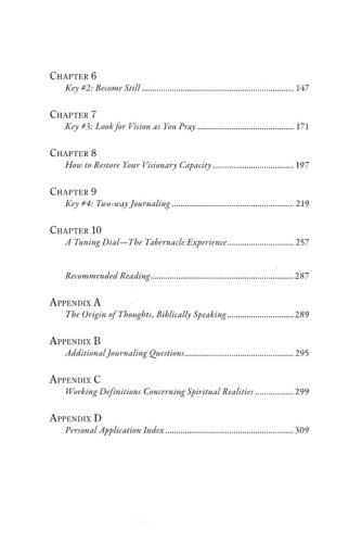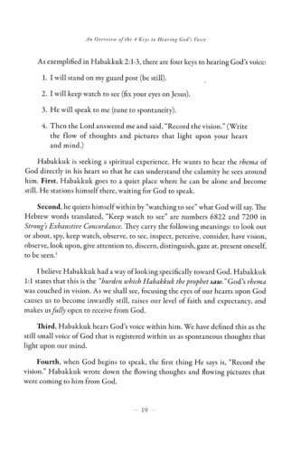 1. How to recognize God’s voice as spontaneous thoughts. 2. Learning how to become still before the Lord. 3. Looking for vision as you pray. 4. Realizing the importance of two-way journaling.