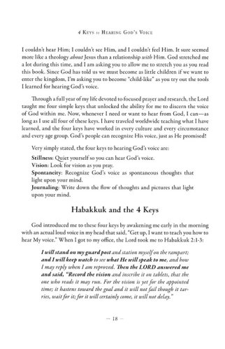 Filled with insights from years of hearing from God, 4 Keys to Hearing God’s Voice also includes visual aids that enhance the teaching and learning experience. Very reader-friendly, you will find that the concepts and principles are easily adapted to your personal circumstances and lifestyle.