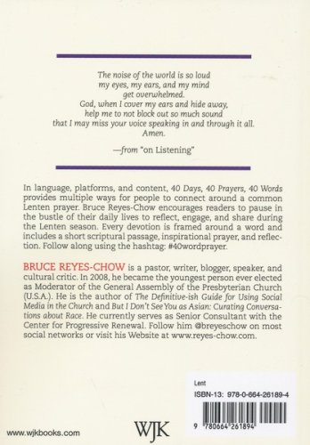 In 40 Days, 40 Prayers, 40 Words, Reyes-Chow encourages readers to pause in the bustle of their daily lives to reflect, engage, and share during the Lenten season. Forty devotions are each framed around a word inspired by the daily lectionary readings and include a short scriptural passage, inspirational prayer, and reflection. Readers who feel too busy for daily engagement with God will appreciate Reyes-Chow�s ability to speak to the blessings and burdens of everyday life in a concise, lively manner. Moreover, readers also have the ability to connect with others through interactive elements like QR codes that link to social media and provide access to additional reflections, graphics, and prayers. This unique resource expands the ways we can connect with God, and with each other, both during Lent and at any time along our journeys of faith. Follow along using the hashtag: #40wordprayer.