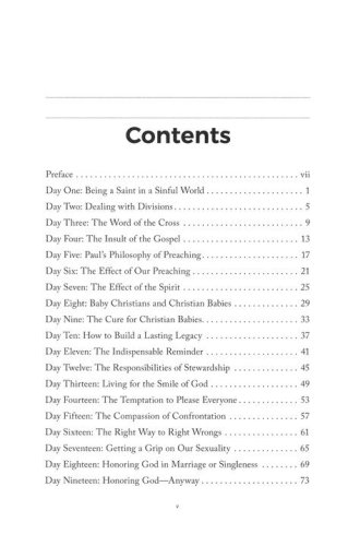 In this volume, readers will be lead through a daily study of 1 Corinthians. 40 Days in 1 Corinthians breaks down the book of 1 Corinthians into chunks that presents the "Big Picture" of the passage, then "Digging Deeper" into that section and then moving to help the reader into "Living Out" the lessons that are taught each day.