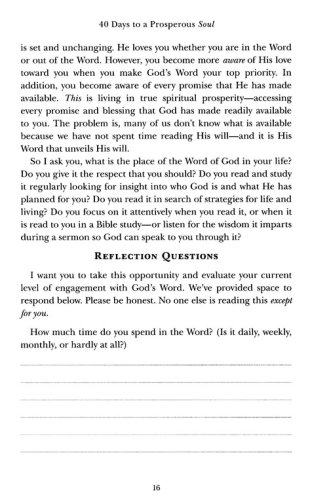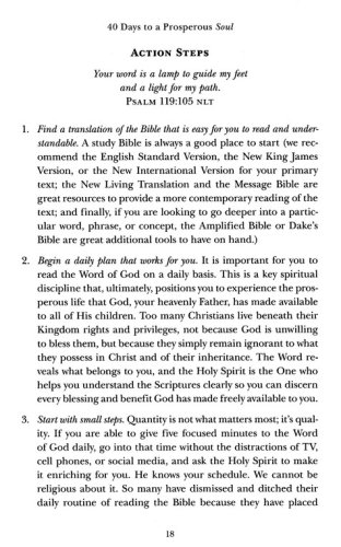 Over the next 40 days, you will… Make key decisions that position you to fulfill your dreams and desires Learn how to enjoy prosperity in every area of your life: Spiritually, mentally, physically, relationally, vocationally, and financially. Discover 40 key practices for living your most prosperous life A prosperous soul is your all-access pass to living a rich and satisfying life. Get ready to start using these 40 practices and enjoy the abundant life that Jesus promised today!