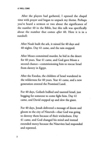 In the Bible, it rained for forty days and forty nights. Day 41 came and the rain stopped. The people of Israel wandered the wilderness for forty years. Day 41 came and a new generation entered the Promised Land. For forty days, Goliath bullied Israel and dared anyone to fight him. Day 41 came and David slew Goliath.