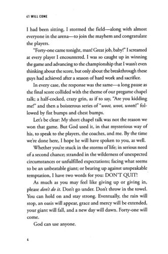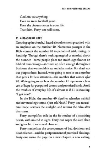 Do you see the theme? Don’t quit. Don’t give up. Perhaps you’re stuck in a downpour or lost in one of life’s deserts. Maybe you’re facing someone or something that could take you down. You might feel stuck on your journey, but 41 will come—it’s on its way.