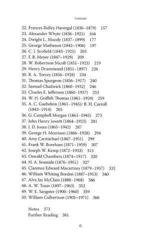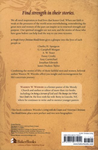 50 People Every Christian Should Know gives a glimpse into the lives of such people as Charles H. Spurgeon, G. Campbell Morgan, A. W. Tozer, Fanny Crosby, Amy Carmichael, Jonathan Edwards, James Hudson Taylor, and many more. Combining the stories of fifty of these faithful men and women, beloved author Warren W. Wiersbe offers today's readers inspiration and encouragement in life's uncertain journey.