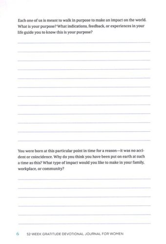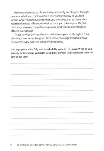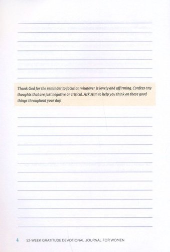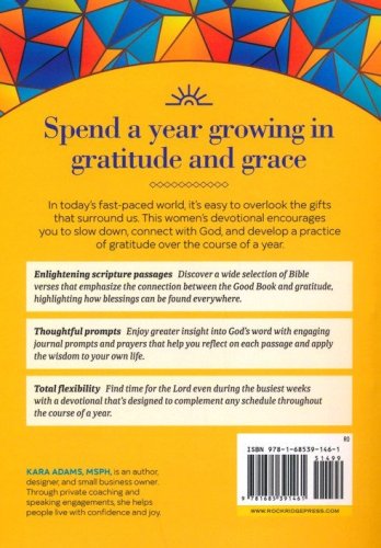 Enlightening Scripture passages – Discover a wide selection of Bible verses that emphasize the connection between the Good Book and gratitude, highlighting how blessings can be found everywhere.Thoughtful prompts – Enjoy greater insight into God's Word with engaging journal prompts and prayers that help you reflect on each passage and apply the wisdom to your own life.Total flexibility – Find time for the Lord even during the busiest weeks with a devotional that's designed to complement any schedule throughout the course of a year.