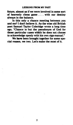 The author recounts his descent into despair and his discovery of spiritual nourishment in the works of Aristotle, Emerson, Ben Franklin, and Plato, and enumerates the seventeen rules that helped transform his life.