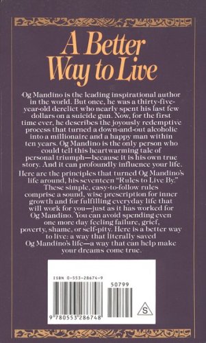 Og Mandino was one of the leading inspirational authors in the world. But once, he was a thirty-five-year-old derelict who nearly spent his last few dollars on a suicide gun. In A Better Way to Live, he describes the joyously redemptive process that turned a down-and-out alcoholic into a millionaire and a happy man within ten years. Og Mandino is the only person who could tell this heartwarming tale of personal triumph—because it is his own true story. And it can profoundly influence your life. Here are the principles that turned Og Mandino’s life around: his seventeen "Rules to Live By."