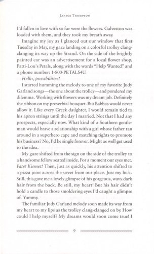 Cassia Pappas has found herself in a nearly impossible situation. She wants to spend her time immersed in her new job at a Galveston Island floral shop, arranging blooms and brightening occasions with her lovely creations. But her huge Greek family–especially her father–has other ideas. They've all relocated to Galveston to open up a new family restaurant location on the Strand–directly across the street from the Rossis' popular pizza place–and they want Cassia's full participation.