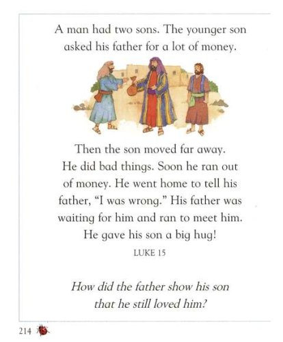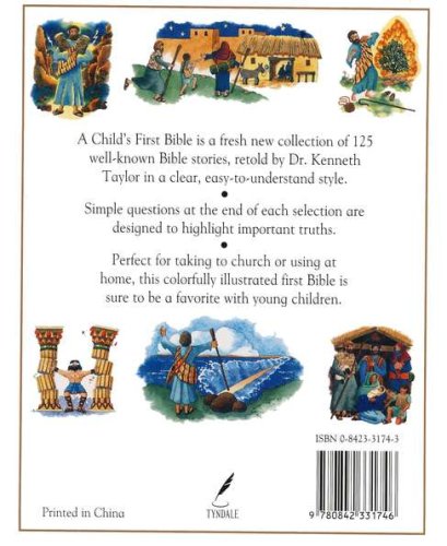 ECPA Platinum Award Winner. This full-color illustrated children’s Bible has been a cherished family favorite for nearly 20 years.125 fully illustrated Bible storiesIncludes stories from the Old and New TestamentsSimple questions at the end of each storyPortable size is perfect for taking to churchMakes a great gift for children ages 2 to 6!Perfect for taking to church or using at home, young children will love this beautifully illustrated first Bible. A Child’s First Bible is a collection of 125 of the most familiar Bible passages, from both the Old and New Testaments.