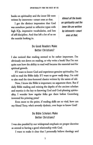 This practical guide speaks to those who are weary of formulaic faith or who are haunted by nagging doubts about the church, as well as those who find the traditional spiritual disciplines impractical or even agonizing because of their personal wiring. Easy to read but filled with challenging ideas, this book provides a spiritual foundation for pastors and teachers, committed Christians, and anyone interested in discovering God for themselves but wary of predictable paths.