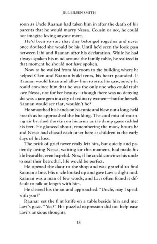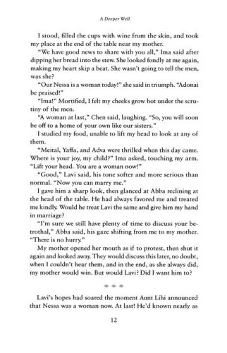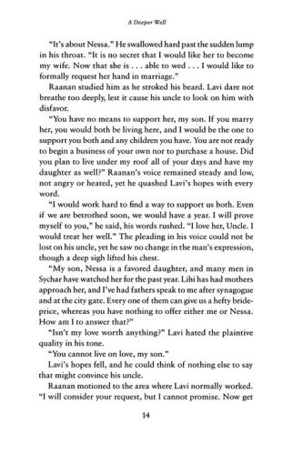 In ancient Israel, soon after Nessa is of marriageable age, her father gives her to a wealthy widowed friend, capitalizing on her beauty to bring in the highest bride-price he can find. Nessa is devastated, as she had begged to marry Lavi, who returned her love and saw more in her than her appearance. Nessa's betrothal leads to Lavi's departure, compounding her grief, and she can never forget her forbidden first love.