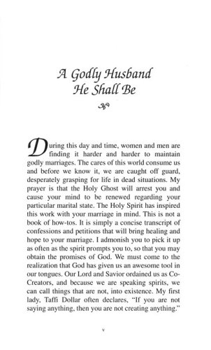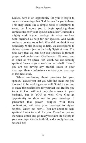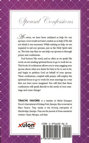 This book of confessions allows you to stop nagging your spouse about what you desire for him to be or not to be, and begin to petition God on behalf of your spouse. These confessions coupled with prayer will employ the spiritual forces to go to work for your marriage in a way that you have never imagined. You will find that these confessions will speak directly to the needs of your marriage and cause change!
