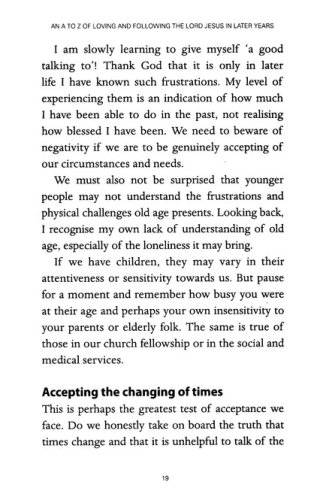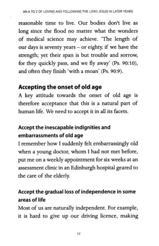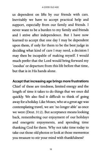 Old age often gets a bad press. Associated with grumpiness, aches and pains, loneliness, and isolation, it's not something we particularly look forward to or relish when we're there. Pastor and Bible teacher Derek Prime, himself in his 80s, shows us that there is another way to view old age. He guides us through 26 Christian priorities that we should hold to in later life. With biblical wisdom and practical advice, he helps us to navigate the unique challenges and joys that old age can bring. This is a book to dip into, meditate on and read prayerfully as you let the truths it contains gently transform the way you live your old age.