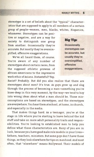 What does society want of teen guys? To be independent, tough, andmacho? To be a sensitive, caring metrosexual? To excel in school andsports and business? The challenges are many, and we haven't evenmentioned the most important-and most frightening-topic ofconversation: girls. The road to manhood is a perilous one.
