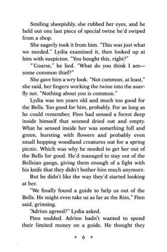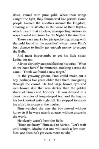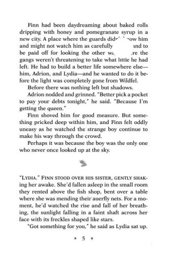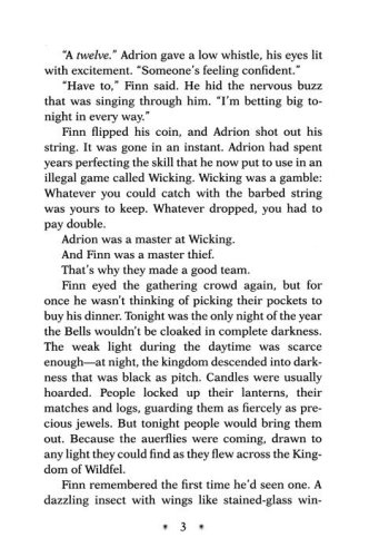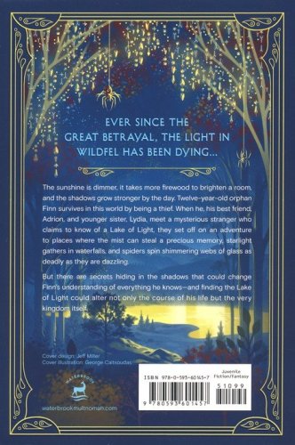 Ever since the Great Betrayal, the light in Wildfel has been dying. The sunshine is dimmer, it takes more firewood to brighten a room, and the shadows grow stronger by the day. Twelve-year-old orphan Finn survives in this world by being a thief. When he, his best friend Adrion, and younger sister Lydia meet a mysterious stranger who claims to know of a Lake of Light, they set off on an adventure to places where the mist can steal a precious memory, starlight gathers in waterfalls, and spiders spin shimmering webs of glass as deadly as they are dazzling.