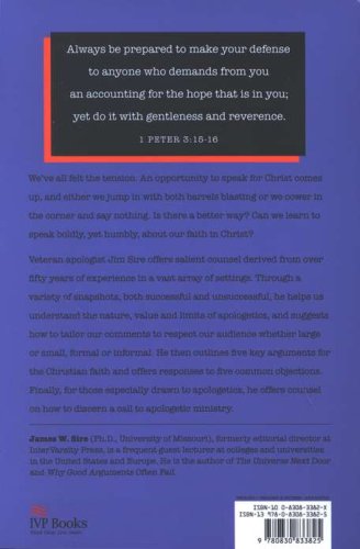Always be prepared to make your defense to anyone who demands from you an accounting for the hope that is in you; yet do it with gentleness and reverence. (1 Peter 3:15-16) We've all felt the tension. An opportunity to speak for Christ comes up, and either we jump in with both barrels blasting or we cower in the corner and say nothing. Is there a better way? Can we learn to speak boldly, yet humbly, about our faith in Christ? Veteran apologist Jim Sire offers salient counsel derived from over fifty years of experience in a vast array of settings. Through a variety of snapshots, both successful and unsuccessful, he helps us understand the nature, value and limits of apologetics, and suggests how to tailor our comments to respect our audience whether large or small, formal or informal. He then outlines five key arguments for the Christian faith and offers responses to five common objections. Finally, for those especially drawn to apologetics, he offers counsel on how to discern a call to apologetic ministry.