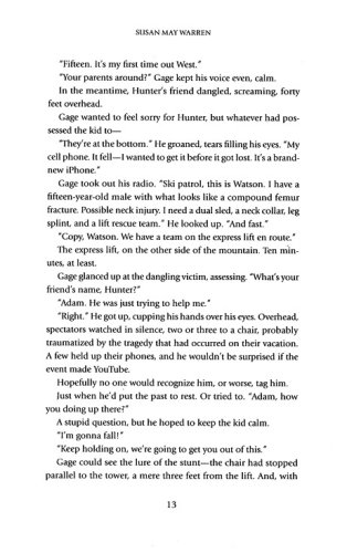 Champion backcountry snowboarder Gage Watson has left the limelight behind after the death of one of his fans. After being sued for negligence and stripped of his sponsorships, he's remade his life as a ski patrol in Montana's rugged mountains, as well as serving on the PEAK Rescue team. But he can't seem to find his footing–or forget the woman he loved, who betrayed him.