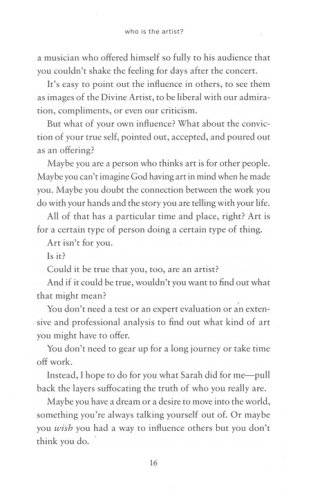 The majority of us would not necessarily define ourselves as artists. We're parents, students, businesspeople, friends. We're working hard, trying to make ends meet, and often longing for a little more–more time, more love, more security, more of a sense that there is more out there. The truth? We need not look around so much. God is within us and he wants to shine through us in a million little ways.