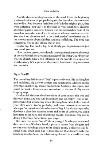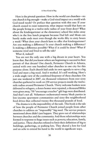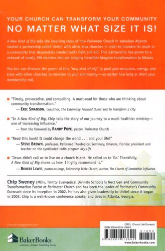 A New Kind of Big tells the inspiring story of how Perimeter Church in suburban Atlanta started a partnership called Unite! with other area churches in order to increase its reach in a community that desperately needed God's light and aid. This partnership has grown to a network of nearly 150 churches that are bringing kingdom transformation to Atlanta. For instance, on just one weekend in 2007, 6,000 volunteers from over 60 churches in metro Atlanta gathered to work on 250 service projects inside the ten-mile radius around Perimeter Church. Thirty welcome baskets were delivered to refugees, a dozen homes were repaired, a thousand Bibles were given away, 750 "encourage a teacher" gift bags were distributed. And that's not all: volunteers orchestrated 20 block parties in low-income apartment communities and 65 neighborhood food drives that collected 25,000 pounds of food.
