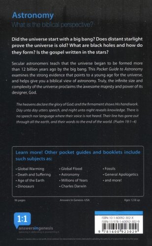 Questions will be asked of creationists-be prepared to give a defense. These pocket guides are easily organized so you can quickly find the answers you need to the most common creationist challenges. Find solutions to astronomy questions such as: Did the universe start with a big bang? Does distant starlight prove the universe is old? What are black holes and how do they form? Can we see stars forming? Are ETs and UFOs real? This succinct 96-page pocket guide is a unique and handy illustrated book that provides excellent summary answers to the big questions of the origin of life. 96 pages, softcover; Ages 12 & up.