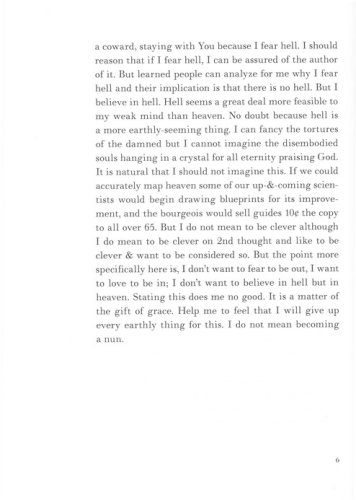 O'Connor could not be more plain about her literary ambition: "Please help me dear God to be a good writer and to get something else accepted," she writes. Yet she struggles with any trace of self-regard: "Don't let me ever think, dear God, that I was anything but the instrument for Your story."