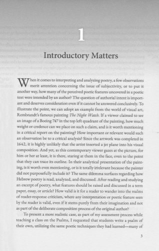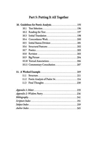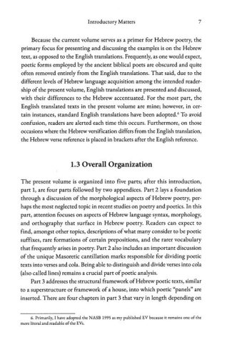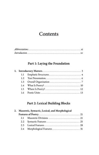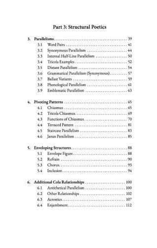 The book is organized into five main sections, beginning with a robust introduction on the idea of Hebrew poetry and where it is dispersed throughout the Hebrew Bible. Three primary chapters follow, addressing Masoretic, lexical, and morphological features, structural poetics, and specific Hebrew poetics. The book concludes with a summary chapter and two helpful appendices.