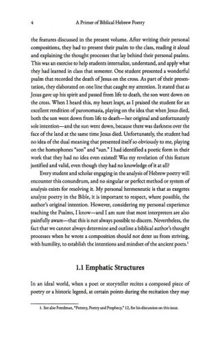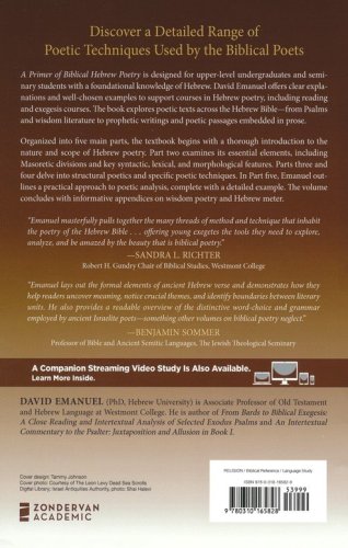 A Primer of Biblical Hebrew Poetry by David Mark Emanuel is an essential language resource for understanding Hebrew poetry in the Hebrew Bible. The textbook describes with examples the range of poetic techniques employed by the biblical poets–encompassing all poetic texts in the Hebrew Bible, including the psalms, wisdom and prophetic literature, and poetic lines embedded within Hebrew prose.