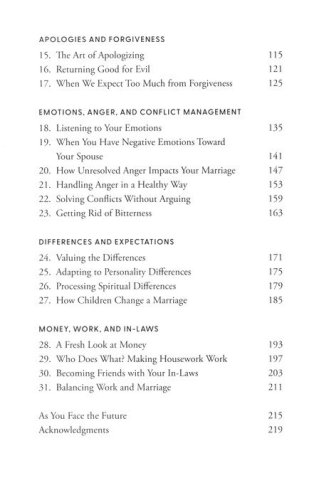 Love and IntimacyCommunicationChanges and DecisionsApologies and ForgivenessAnger and Conflict ManagementAttitudes, Differences, & ExpectationsMoney, Responsibilities, & In-Laws