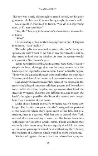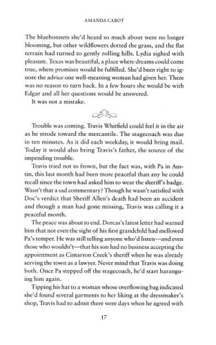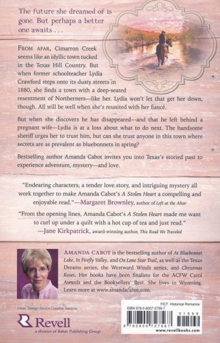 From afar, Cimarron Creek seems like an idyllic town tucked in the Texas Hill Country. But when former schoolteacher Lydia Crawford steps onto its dusty streets in 1880, she finds a town with a deep-seated resentment of Northerners–like her. Lydia won't let that get her down, though. All will be well when she's reunited with her fiancé. But when she discovers he has disappeared–and that he left behind a pregnant wife–Lydia is at a loss about what to do next. The handsome sheriff urges her to trust him, but can she trust anyone in this town where secrets are as prevalent as bluebonnets in spring?