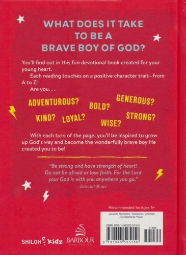 This faith-building devotional joins the Brave Boys lineup of books for the boys in your life. A to Z Devotions for Brave Boys introduces boys to a positive character trait for every letter of the alphabet alongside an inspiring devotional reading. Including topics like Adventurous, Loyal, Kind, Strong, Wise, and twenty-one others, your brave boys will come to understand the importance of each trait and the biblical truths behind them. Every turn of the page highlights a brand-new letter of the alphabet alongside delightful illustration. Scripture quotations are from the easy-to-understand New Life Version!