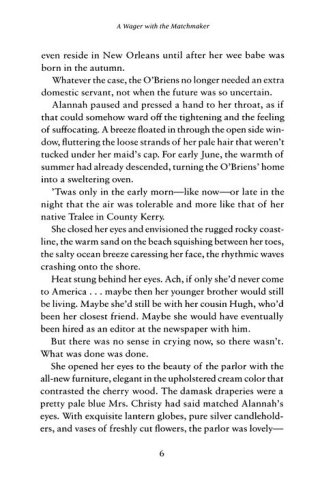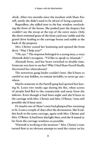 In the wake of a devastating fire, Kiernan Shanahan sees a shrewd opportunity to invest in a clay mine and brickyard to aid the city's rebuilding. To secure his venture, he seeks a wealthy bride with a substantial dowry. However, the matchmaker he consults has different plans. As danger looms and Alannah fights to keep her brother safe, Kiernan's protective instincts draw them closer, but a future together seems too far out of reach. It will take a miracle–or a wager with the wily matchmaker–to form a match between the unlikely couple.
