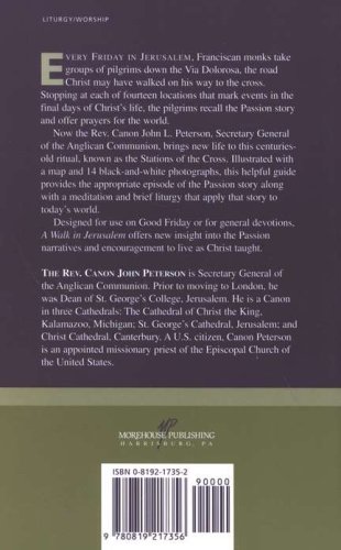 In A Walk in Jerusalem, The Rev. Canon John L. Peterson, Secretary General of the Anglican Communion, brings new life to this centuries-old ritual known as the Stations of the Cross. Illustrated with a map, 14 black-and-white photographs, and 14 pen-and-ink drawings, this helpful guide provides the appropriate episode of the Passion story along with a meditation and brief liturgy that apply that story to today’s world.