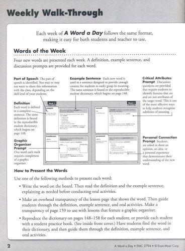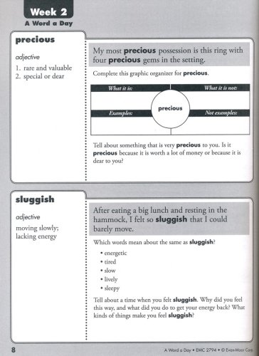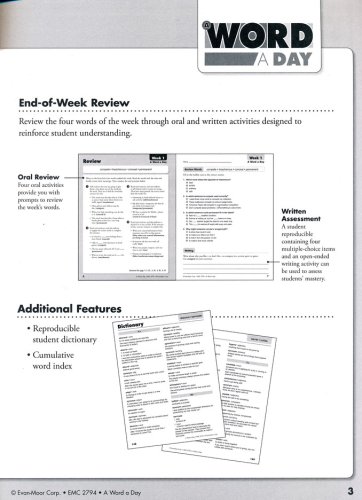 Build up stores of vocabulary with just one word a day! Each week, four new words are presented with a definition, sample sentence, and discussion prompts (one per day). The fifth day is used for an end-of week review that reviews the four previously-learned words through oral & written review exercises. A reproducible student dictionary and cumulative word index are also included. 160 reproducible pages, softcover. Grade 4.