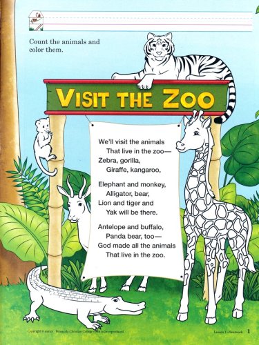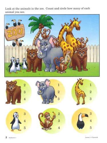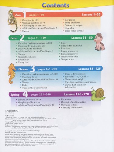 The Abeka Arithmetic 1 workbook builds on prior learning and presents new concepts in an orderly fashion with consistent review. Grade 1 concepts include counting, writing and reading numbers, place value, addition and subtraction, money, graphs, measurement, time, temperature, and fractions. Four units each have their own fun delightful theme with full-color illustrations: zoo, farm, ocean, and spring. Classwork and seatwork pages feature applications to real-world situations and "thinking cap" activities designed to work students' thinking abilities.