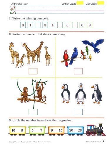 The Abeka Arithmetic 1 Tests & Speed Drill Student Book includes 32 weekly tests and 126 speed drills (4 per week beginning in Lesson 14). Tests include a written test and oral evaluation. Directions and parts of some tests are in the Arithmetic 1 Curriculum Lesson Plans (not included and sold-separately).