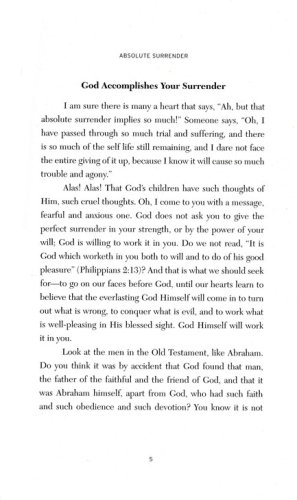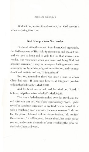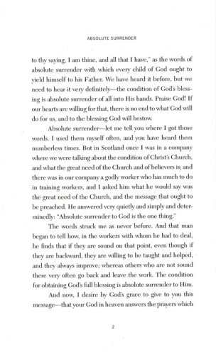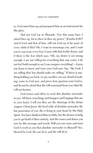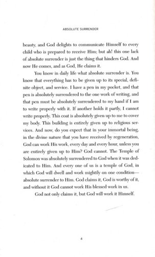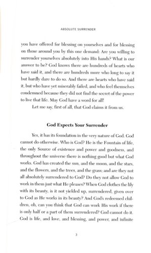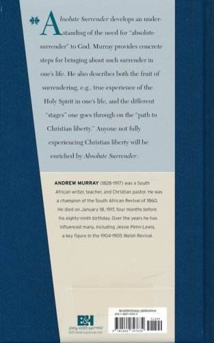 Absolute Surrender develops an understanding of the need for "absolute surrender" to God. Murray provides concrete steps for bringing about such surrender in one's life. He also describes both the fruit of surrendering, e.g. true experience of the Holy Spirit in one's life, and the different "stages" one goes through on the "path to Christian liberty." Anyone not fully experiencing Christian liberty will be enriched by Absolute Surrender.