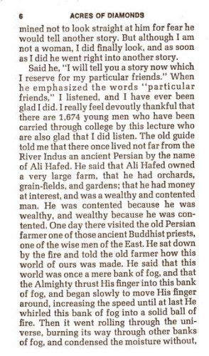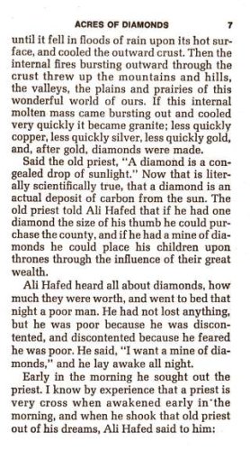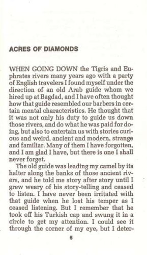 So begins one of the most famous speeches of the twentieth century, a talk that educator and minister Russell H. Conwell delivered before literally thousands of audiences before his death in 1925. In its printed version Acres of Diamonds reached millions of readers around the world. Conwell's great manifesto imparts one extraordinary lesson: All the wealth you could ever dream of, search for, or yearn after—in whatever form you wish for—exists right beneath your own feet. It is a message of determination, unconventional thinking, and positive living that came to influence a generation of motivational literature.